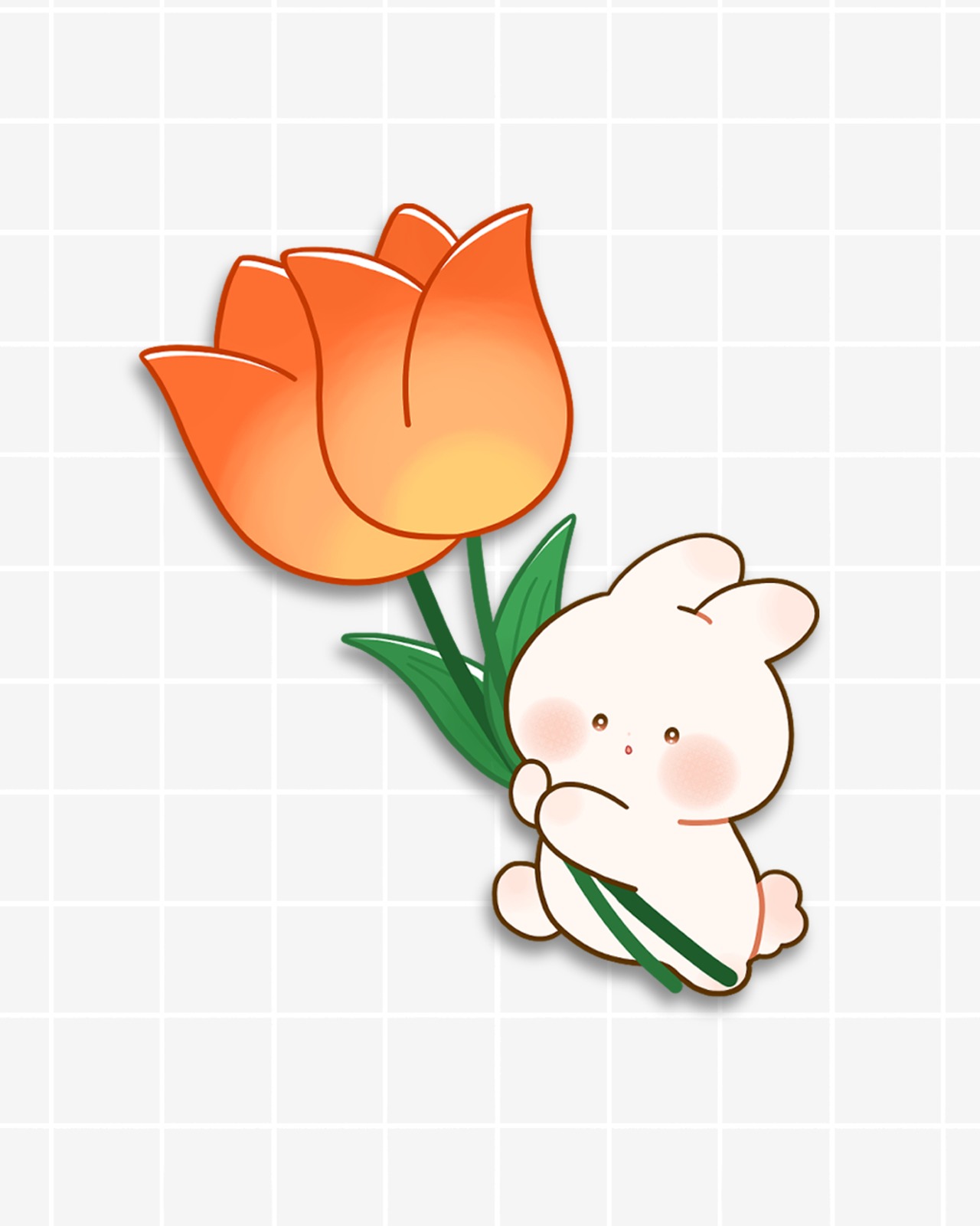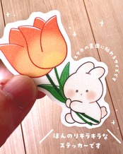 ほんわりした雰囲気のうさぎさんがチューリップを運んでいる様子を描いたステッカーです。
