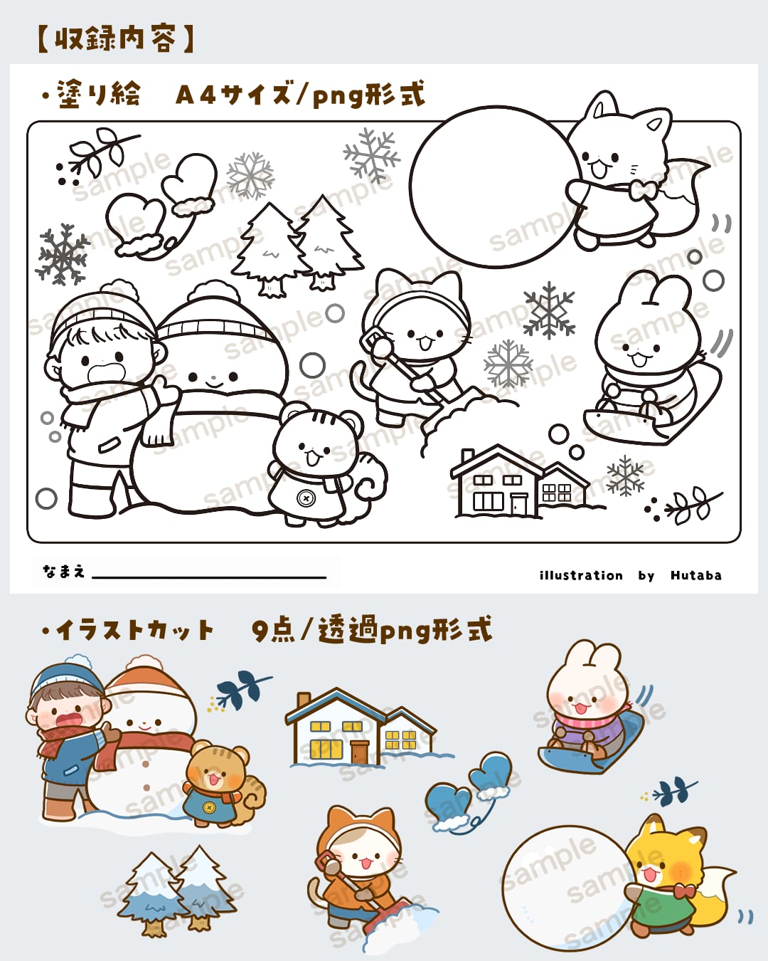 ・差分のイラストがフタバのフリーイラストに収録される場合がございます。(例えば今回収録している「そり滑りをしているうさぎさん」が猫さんバージョンになってイラストサイトに登録する可能性がございます。)